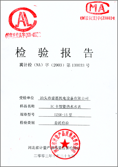 檢驗報告 “IC卡智能熱水水表IZSR-15型”