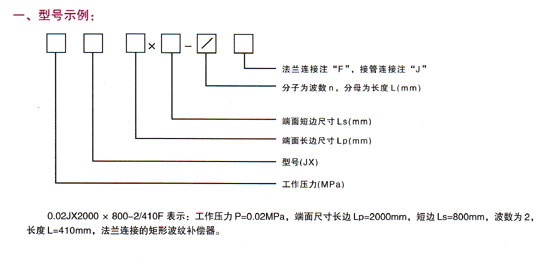 矩形波紋補(bǔ)償器型號(hào): 本廠生產(chǎn)DN1000-DN5000,壓力級(jí)別0.01-0.25Mpa;矩形波紋補(bǔ)償器字母代號(hào)PJX,也可簡單寫為JX。矩形波紋補(bǔ)償器型號(hào)書寫示例:0.02JX*2000*800-2/410F。0.02表示工作壓力,端面尺寸長邊2000mm,短邊800mm,波數(shù)為2,高度410mm,F(xiàn)法蘭連接。