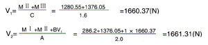| b、G1點: Fx=-V1=-1660.37N Fy=Fz=0 Mx=My=Mz=0 D1點: Fx=Fz=0,Mx=My=0 Fy=V2=1661.31N M2=-MⅡ+V2×L′-V1(20-B-C) =-1280.55+1661.31×2-1660.37(20-1.0-1.6) =-26848.37(N·m) D2點: Fx=Fz=0,Mx=My=0 Fy=-V2=-1661.31(N) Mz=MⅠ-Fy(2+LⅠ/2)=286.2+1661.31(2+0.8/2)=4273.34(Nm) 受力圖: |