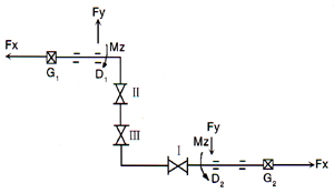| 所以沿工作位移相反方向進行冷緊安裝(冷緊量δ=74.04mm) 4、鉸鏈波紋補償器計算支座承受載荷: 下面分析固定支座G1、G2和導(dǎo)向支架D1、D2的受力情況。 a、膨脹節(jié)變形力矩。 |